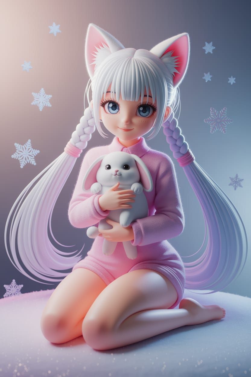 A 3D anime-style illustration of a cat woman with white pigtails, wearing pink and holding a rabbit. She sits on snow amid snowflakes and sparkling particles in kawaii style.