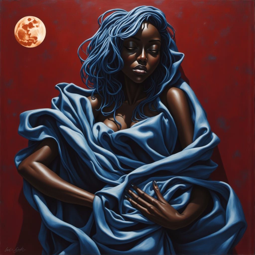 A digital relief sculpture of a dark-skinned woman holding blue satin fabric against a metallic burgundy background. The artwork features delicate glassigami and birefringent effects.