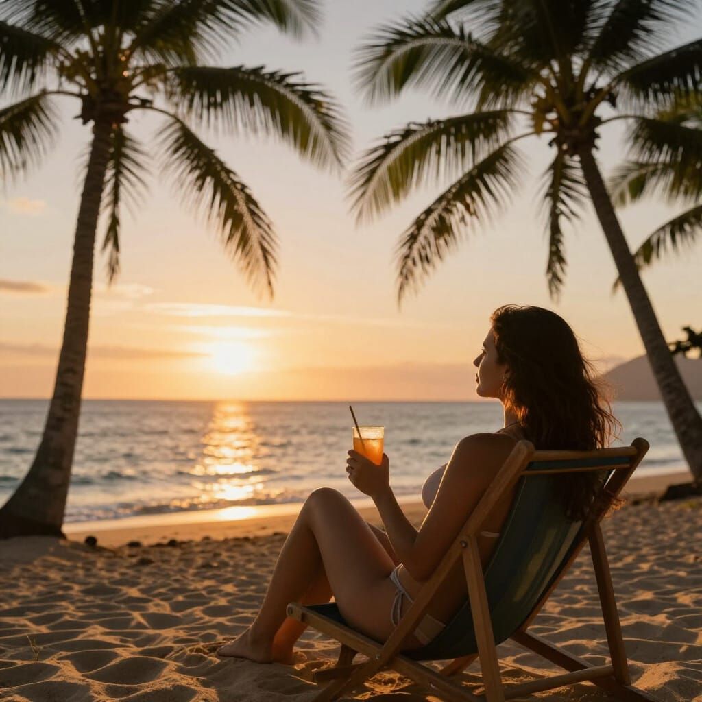 This image shows a woman in a bikini relaxing in a beach chair, holding a drink and watching a vibrant ocean sunset from behind. Photorealistic and cinematic.