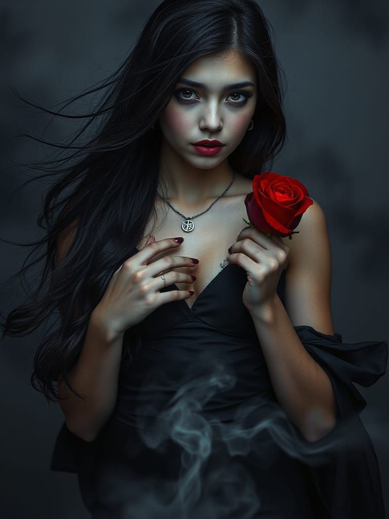 This image shows a dark fantasy portrait of a sorceress with black hair, holding a red rose in twilight. The scene is rendered with moody lighting and realistic textures.