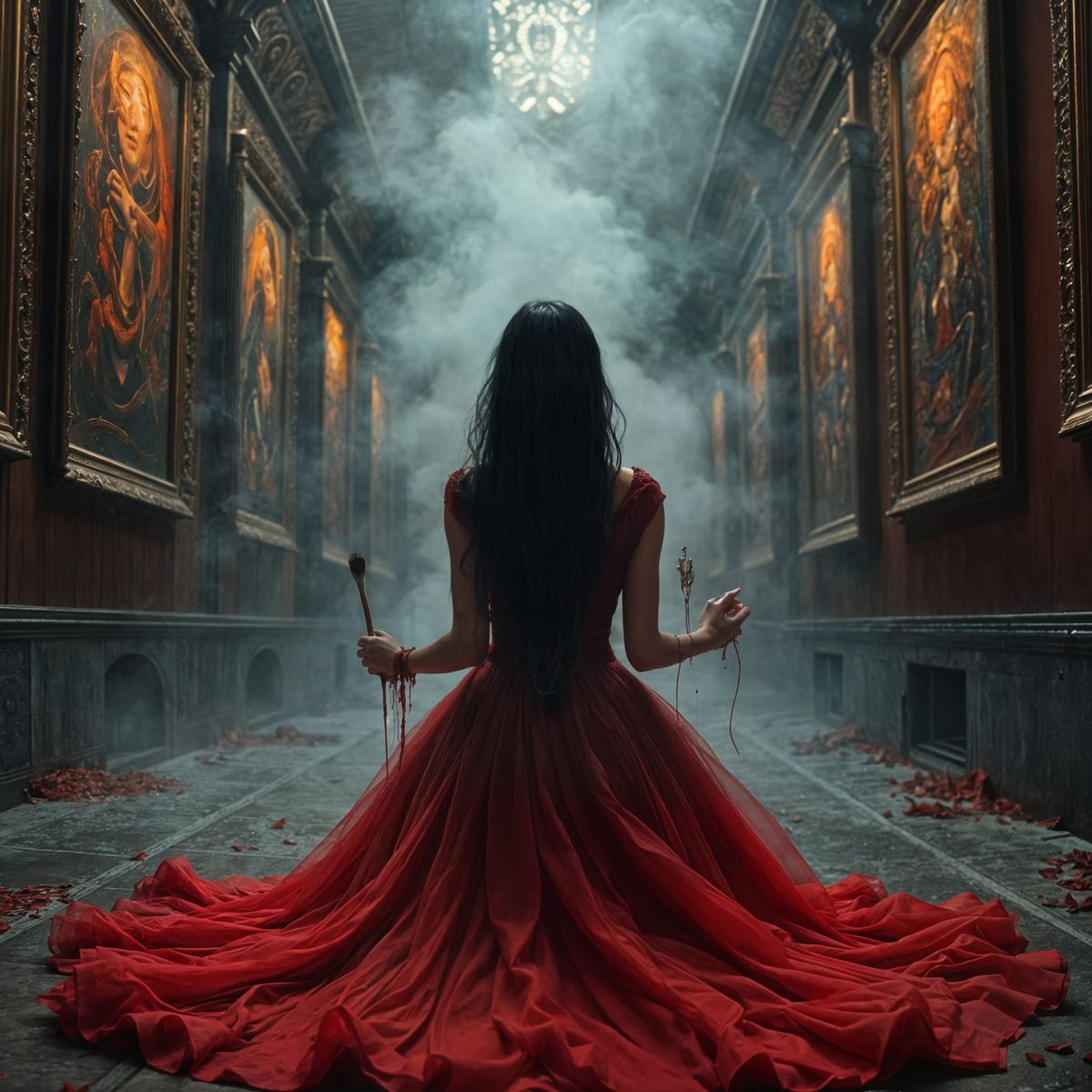 This image depicts a woman with dark hair and a red dress sitting in front of an art gallery, surrounded by fantastical elements and intricate details, showcasing a unique blend of fantasy concept art and realistic color palette.