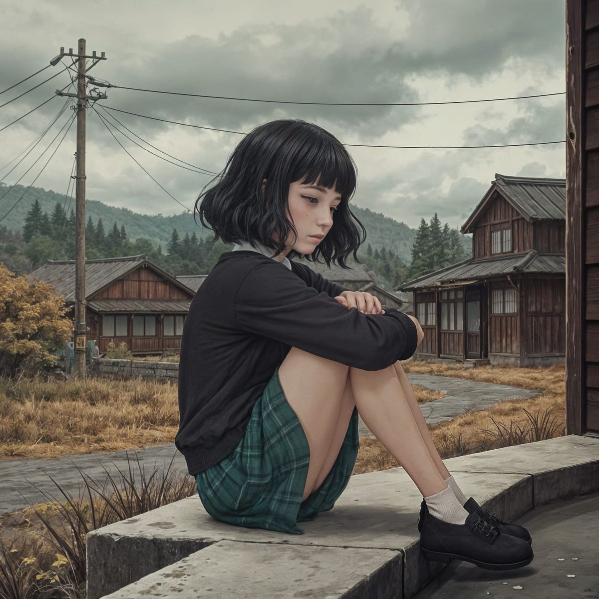 A sad anime girl sits alone on a ledge in a rural Japanese village. The illustration features soft shadows, muted tones, and vintage color grading, creating a melancholic, painterly feel.