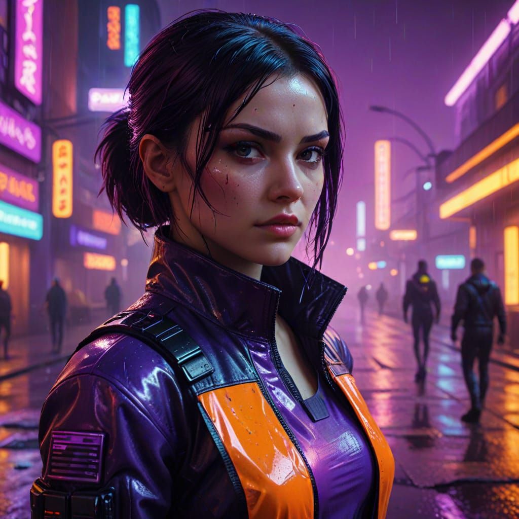 This image depicts a young woman in a cyberpunk-inspired 007 agent uniform, set against a vibrant orange background with neon lights reflecting off wet pavement. The scene is rendered in a hyper-realistic digital art style with detailed textures and triadic colors.