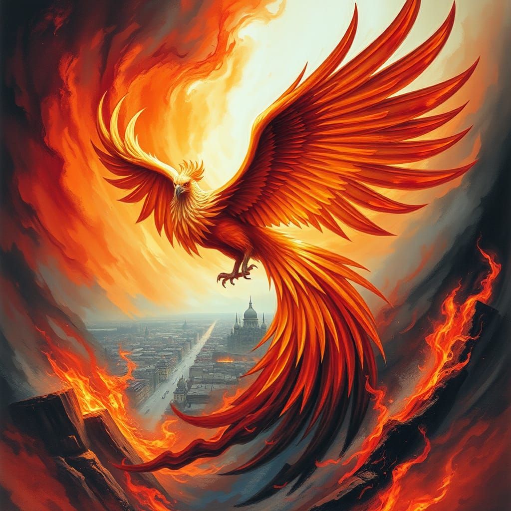 A vibrant image of a phoenix rising from flames with a distant cityscape in the background. This artwork uses bold brushstrokes and iridescent colors in a surreal style.