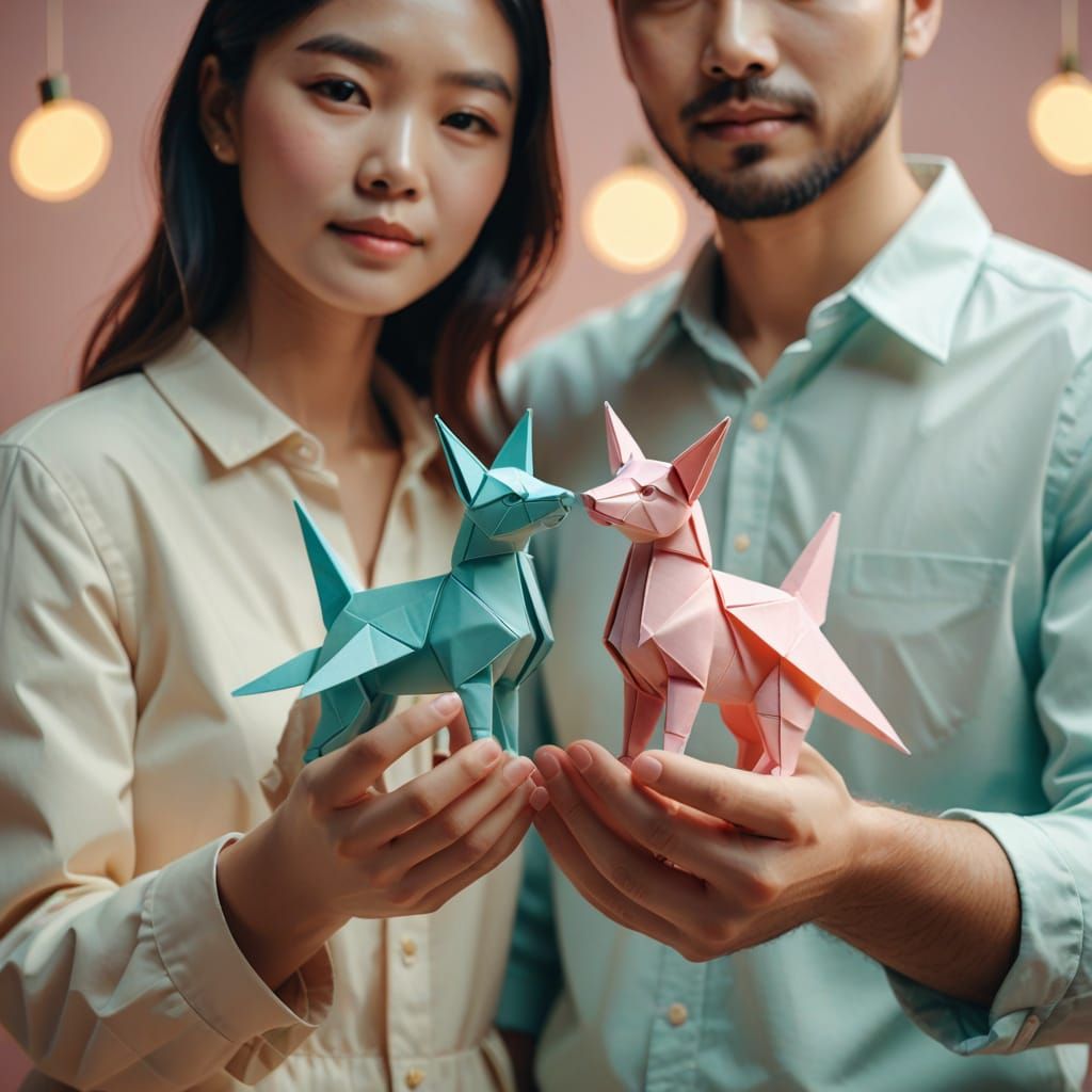 This image shows a tender moment between two people holding delicate origami animals made of paper, created with soft pastel colors and a gentle texture, evoking a sense of love and warmth.