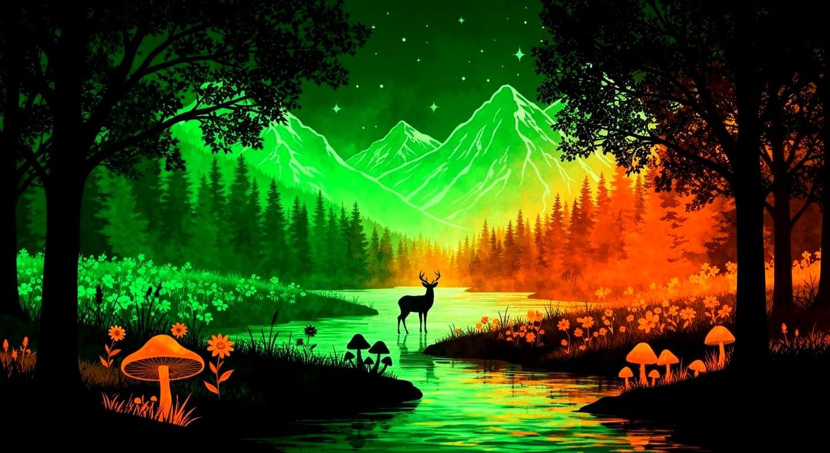 This image shows a vibrant double exposure landscape featuring neon green and orange hues. The artwork contains silhouettes of trees, mountains, a river, flowers and deer.