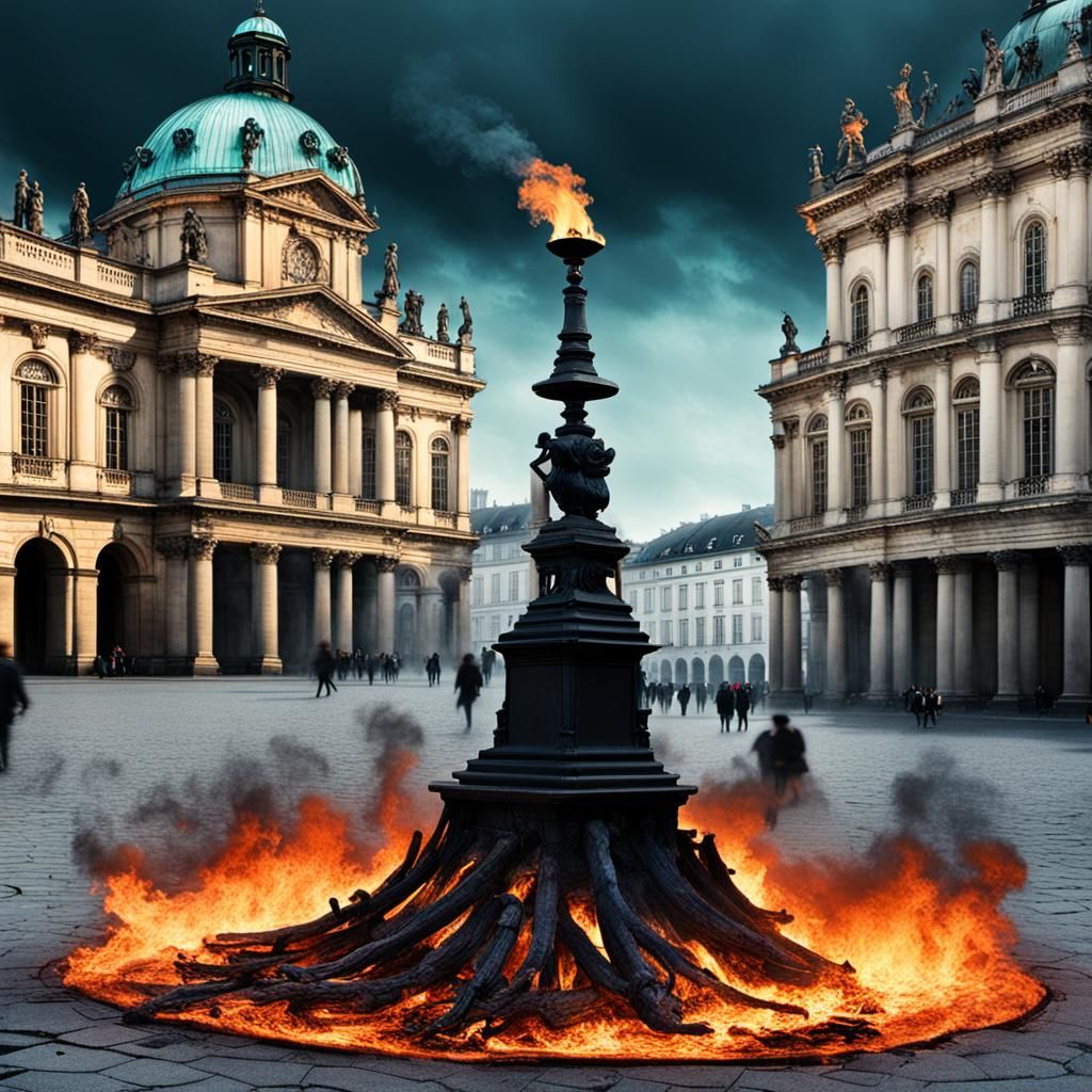This image depicts the Bebelplatz book burning with action painting elements. The street art is rendered in contrasting colors reminiscent of Tim Burton's style.