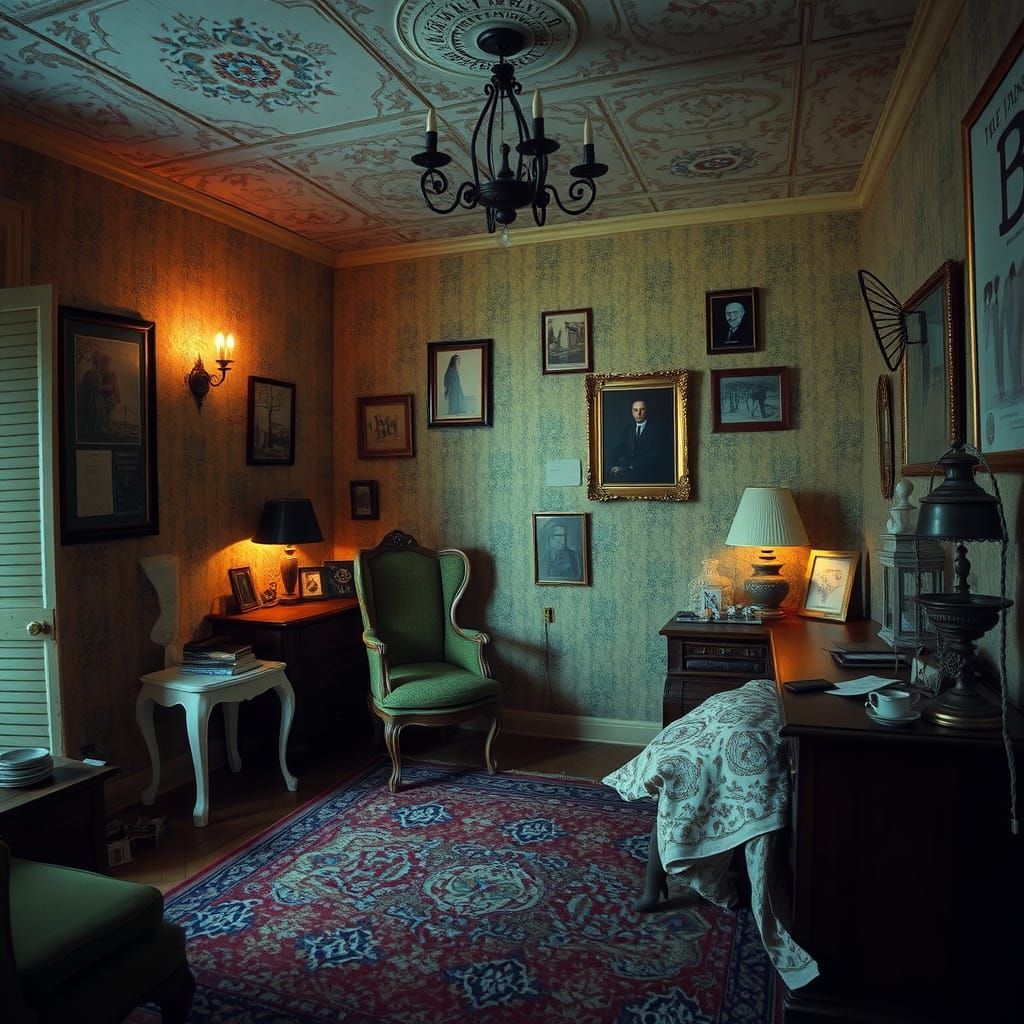 A surreal image of a room filled with hidden objects and dreamlike hallucinations. The artwork evokes a magical and otherworldly atmosphere in a surreal style.