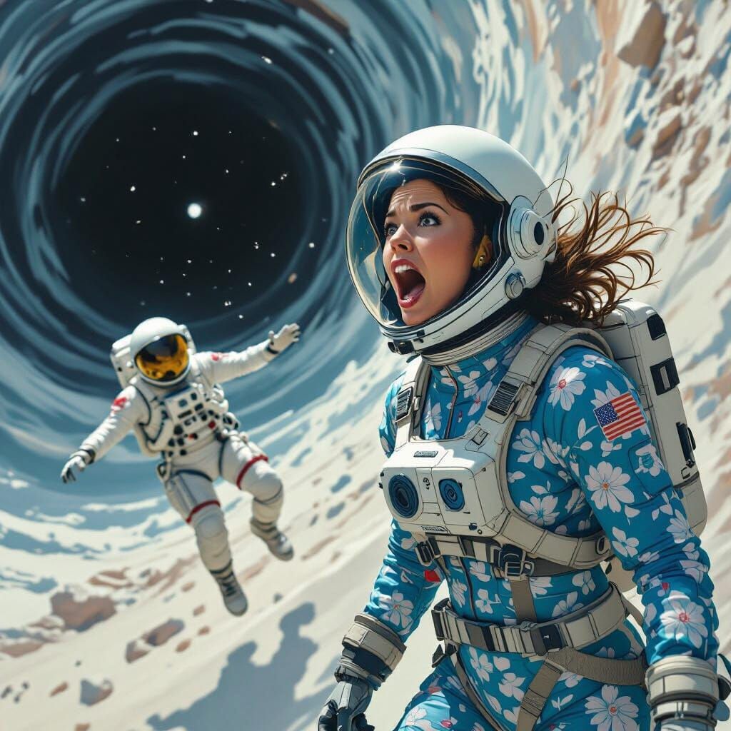 A dramatic image shows a space explorer's horror as her husband falls into a black hole. This digital artwork captures the scene with surreal and emotionally intense detail, set against a sci-fi backdrop.