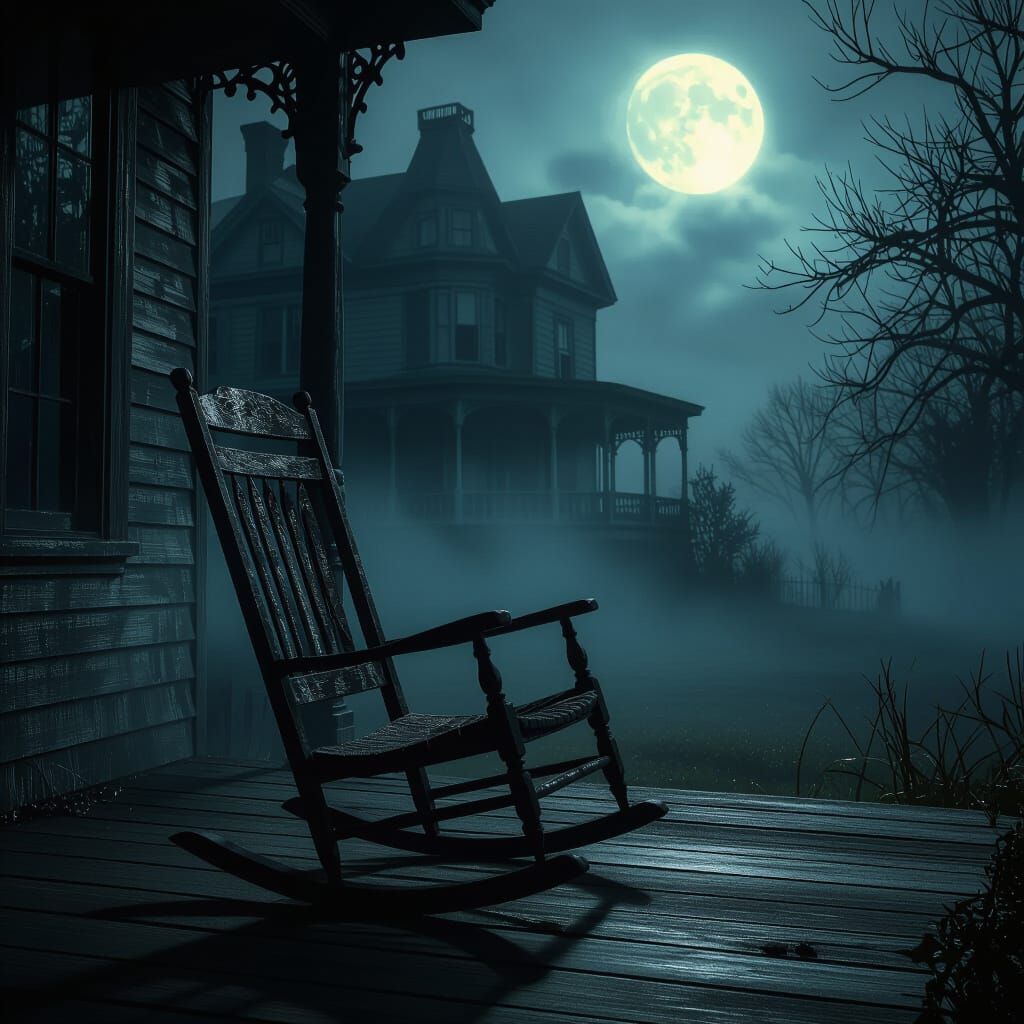This image shows a weathered rocking chair on a haunted mansion's porch, shrouded in fog and ghostly moonlight. The scene evokes a dark, gothic aesthetic with intricate details and a touch of cosmic horror.