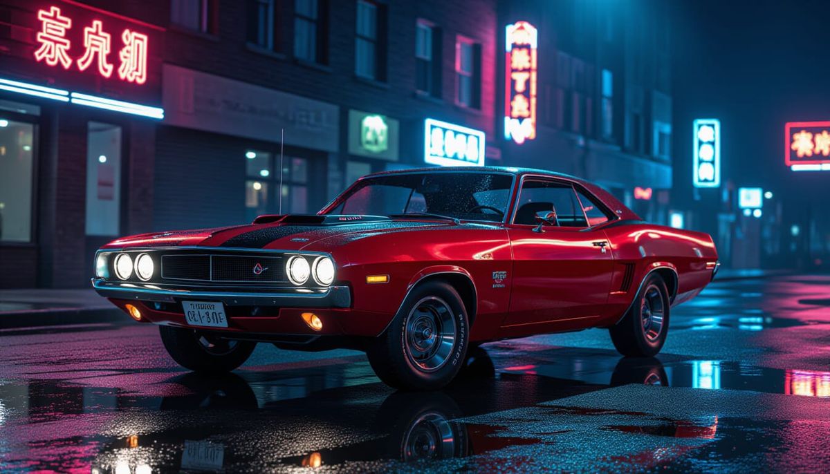 This image captures a classic late-60s American muscle car parked on a wet, neon-lit city street at night. Features include glistening chrome, a hood scoop, and moody fog, presented in a photorealistic cinematic style.