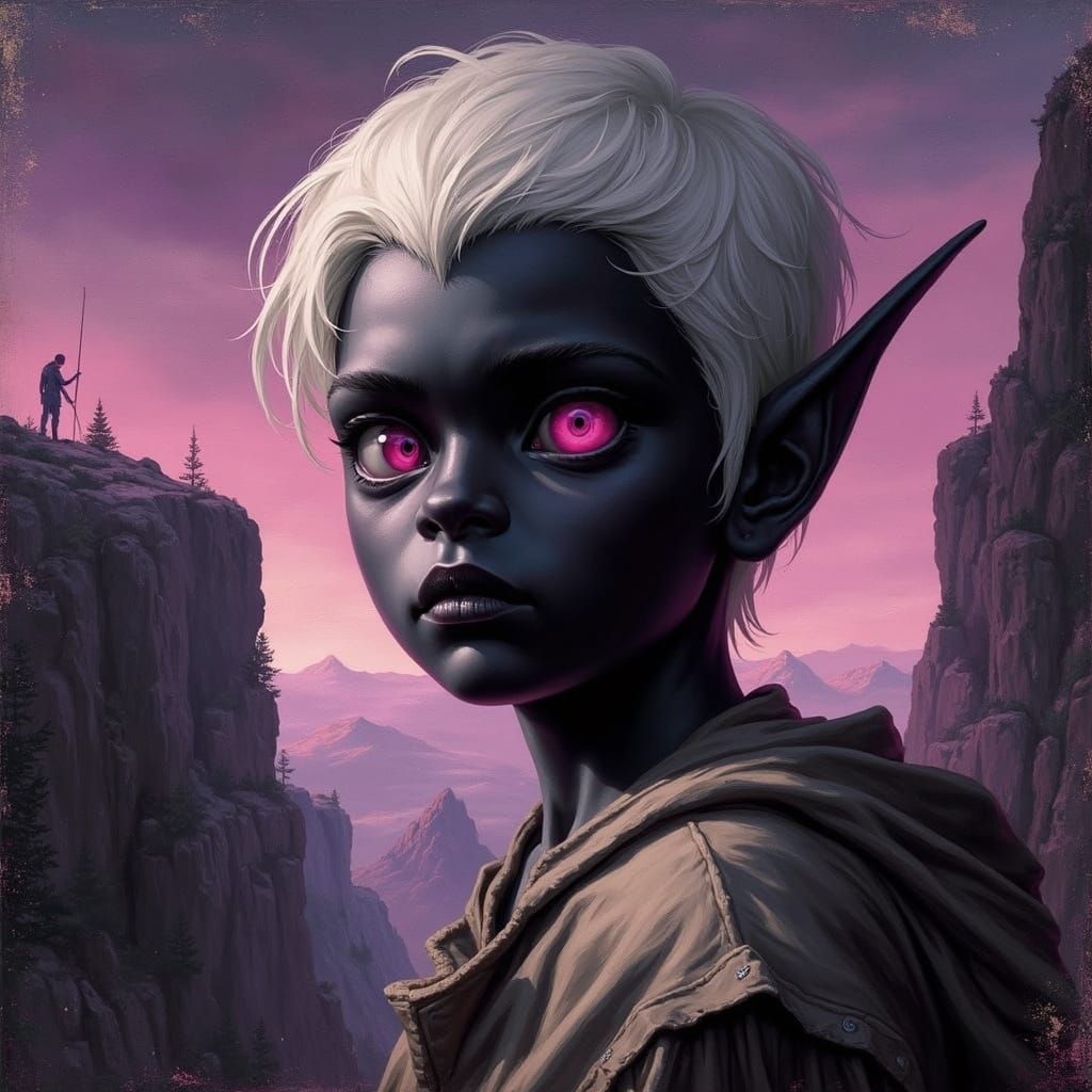 This image depicts a young elf boy with piercing pink eyes and black skin, standing on a rugged, amethyst-hued cliff. He has white hair and is surrounded by an eerie, mystical aura, evoking a sense of foreboding and mystery, reminiscent of dark fantasy art.