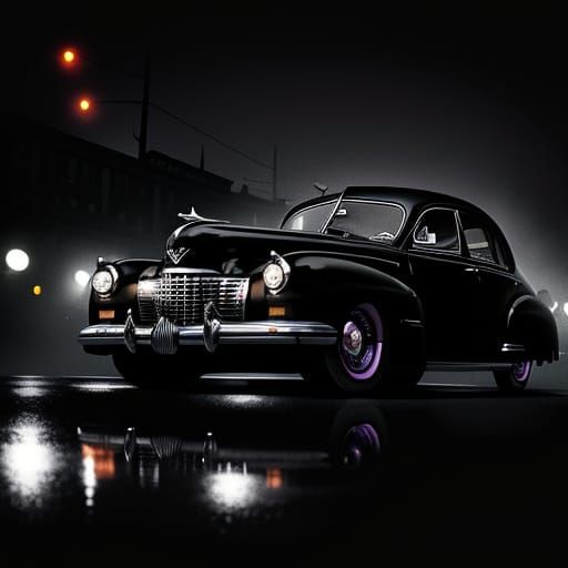 This image shows a black Cadillac driving through city streets at midnight in a film noir aesthetic. Reflections on chrome and cinematic grain add to the moody atmosphere.