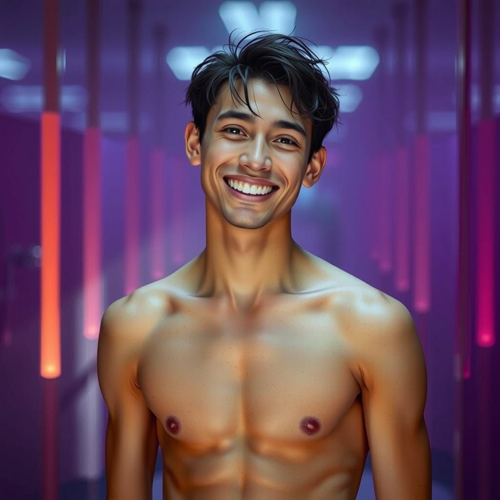 A slender 18-year-old man with a confident smile poses in tight black lycra shorts. The vibrant setting features futuristic and athletic aesthetics as digital artwork.