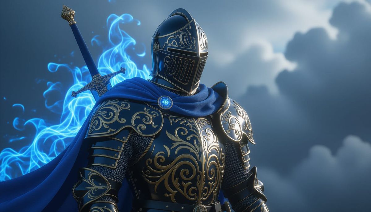 A photorealistic image of a knight clad in black and gold glass armor with a blue cape. The helmet displays carved smiling and sad faces, with a glowing blue blade and mana aura against dark clouds. Cinematic lighting enhances the detail.