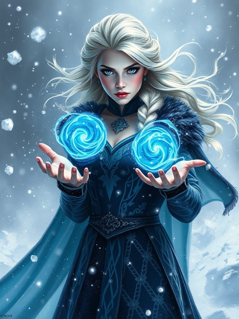 A powerful ice queen stands amidst a fierce blizzard, exuding an otherworldly presence. Icy, vibrant colors and dramatic lighting create a striking, hyper-realistic dark fantasy scene.