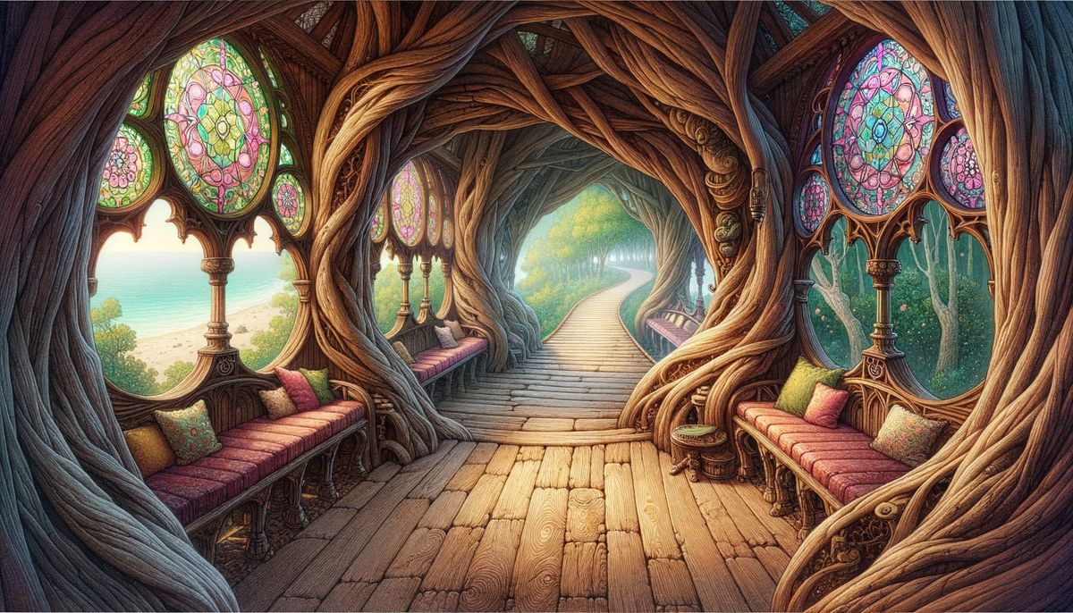 A whimsical illustration of a wooden walkway nestled within a thriving tree branch, featuring stained glass windows, antique-style furniture, and a glimpse of a verdant forest and sandy beach beyond