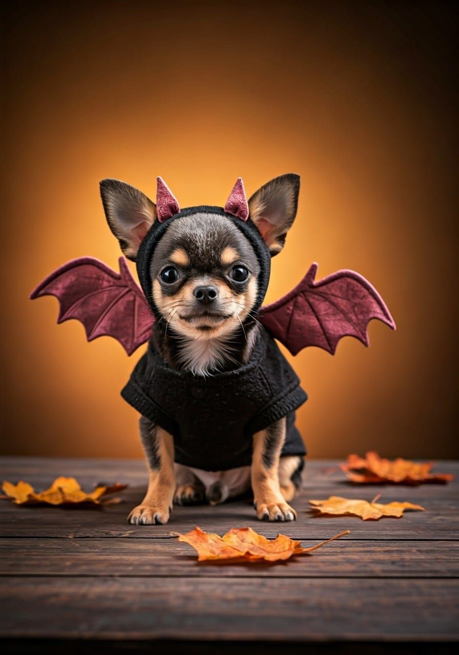 A charming image of a chihuahua dressed as a bat for Halloween. The dog sits amid autumn leaves on a wooden table, captured with realistic photography and atmospheric lighting.