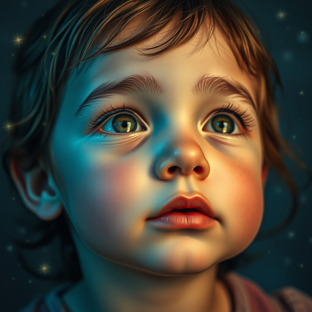 This image shows a hyperrealistic 3D portrait of a child looking upwards dreamily. The artistic style is reminiscent of classical portraiture, featuring soft lighting, delicate skin textures, and a cosmic color palette.