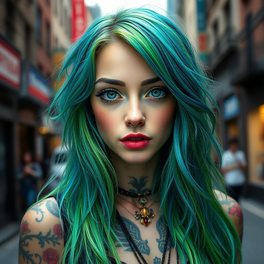 This image captures a confident young woman with a unique blend of bohemian style and vibrant colors, set against a city backdrop. With intricate details and textures reminiscent of hyperrealism, she embodies creative spirit and modern sophistication.