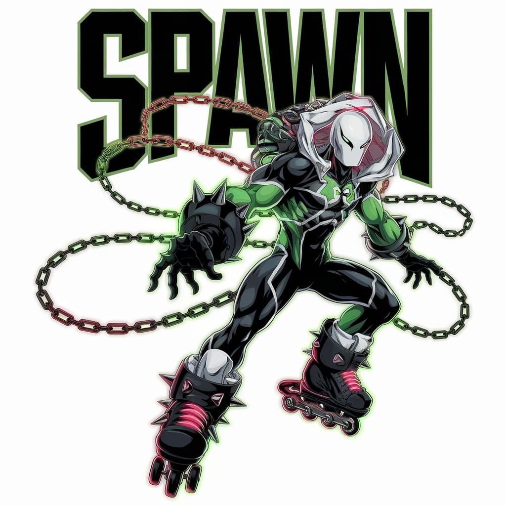 This image shows a vector-style anime t-shirt design featuring the anti-hero Spawn. He's depicted in his symbiotic suit with glowing chains and roller blades against a white backdrop.