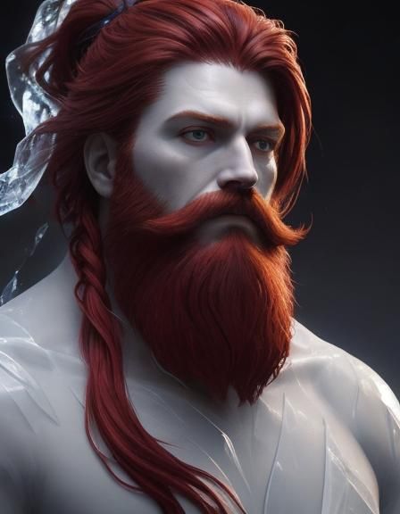 A striking picture of an ice sculpture of a stoic man with long, flowing ruby red hair and beard. The sculpture glows with internal light, creating a dreamy, majestic effect in fantasy realism.