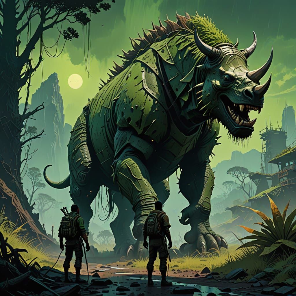 A haunting image of a rugged alien boy standing alongside a fusion creature in a mist-shrouded landscape, blending cinematic style with gritty textures and atmospheric depth