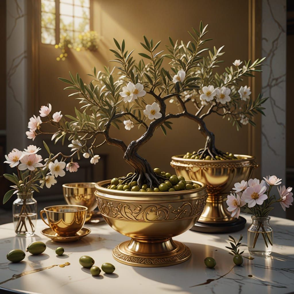A striking picture of two olive trees on a flower-covered table, pouring oil into a golden bowl. This surreal image features hyper-realistic details and marble leaves under soft, golden light.