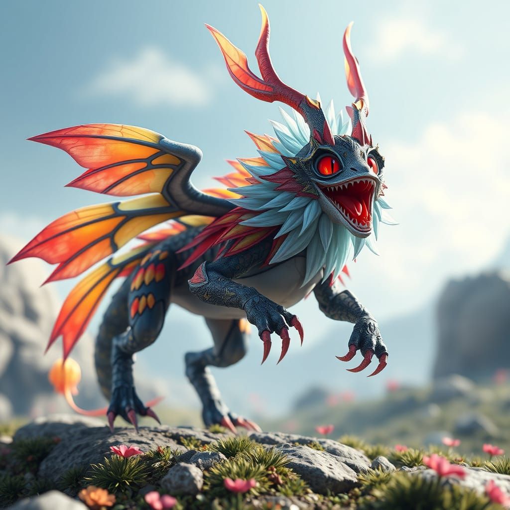 A vibrant, anime-inspired 3D render of a hybrid creature blending a ring-tailed mongoose and comet moth. The image boasts ultra-fine textures and breathtaking realism with a Genshin Impact aesthetic.