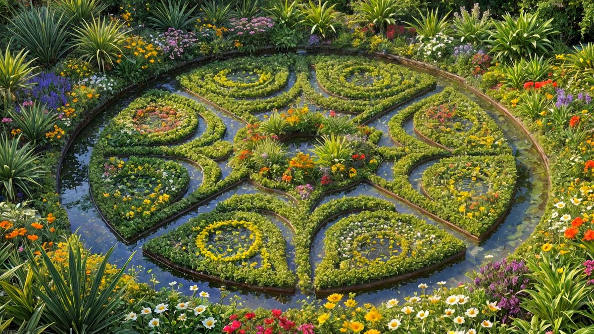 This image showcases a perfectly balanced biophilic garden design. Intricate patterns of lush greenery and colorful flowers are arranged symmetrically, with water flowing through the scene under dappled sunlight.