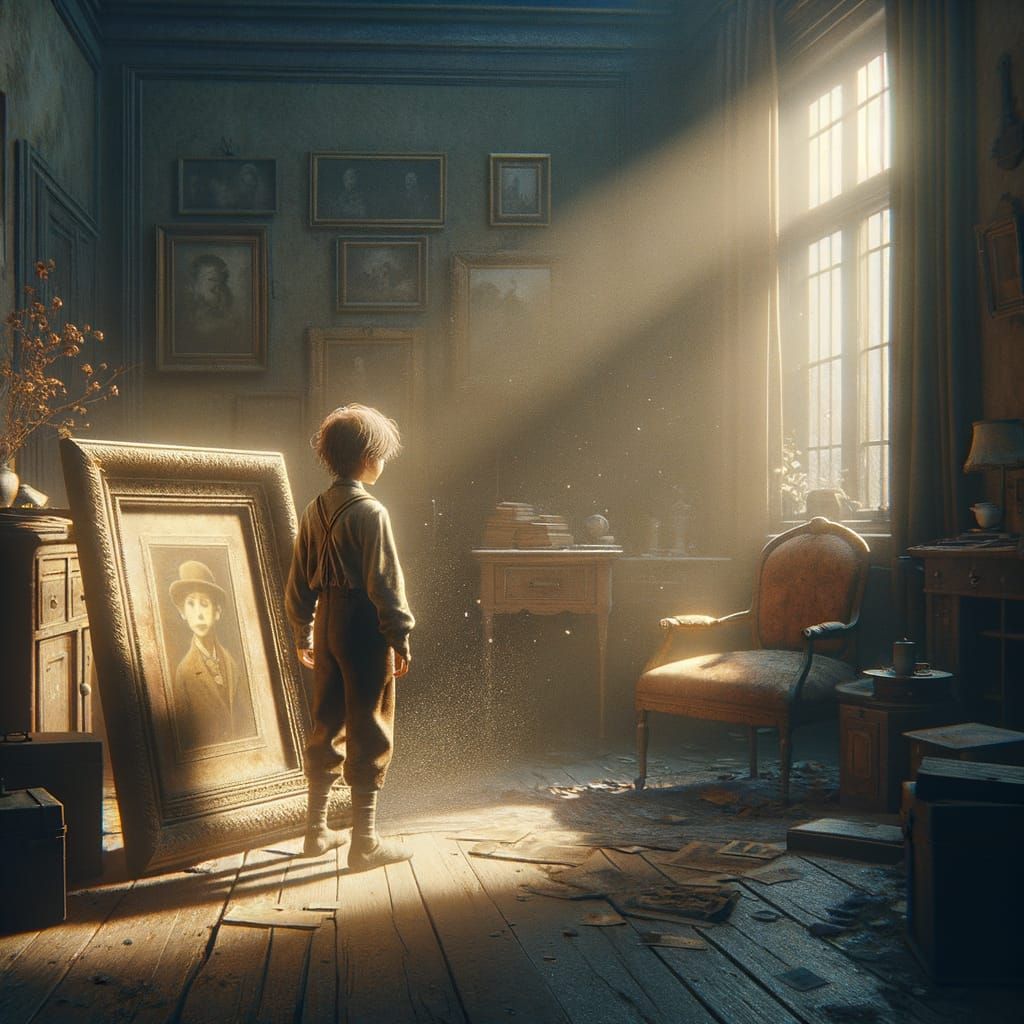 This poignant image depicts a dimly lit, vintage living room filled with nostalgia and longing. A youthful figure stands alone, lost in thought, surrounded by the remnants of forgotten memories. Rendered in a warm, muted palette with hints of blue, the scene exudes a sense of quiet sadness and wistfulnes...