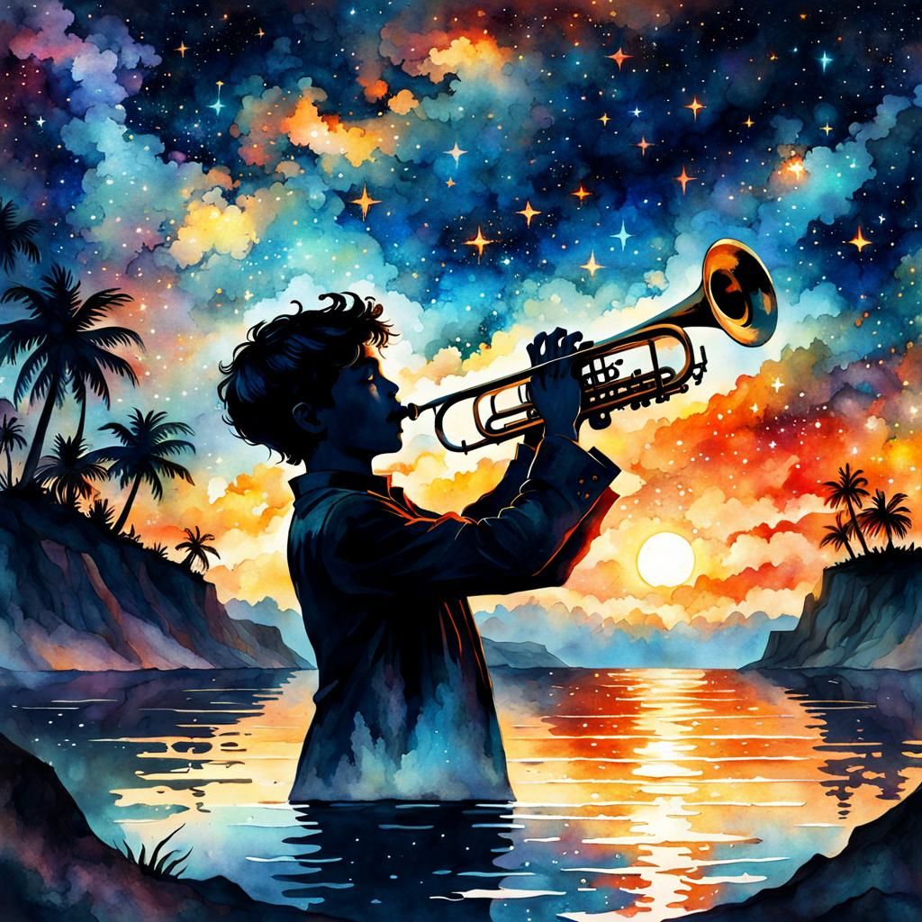 A watercolor painting of a boy silhouetted against a star-filled Titanic, playing a trumpet on an island at sunset. Warm colors and intricate details create a fantastical, high-resolution scene.