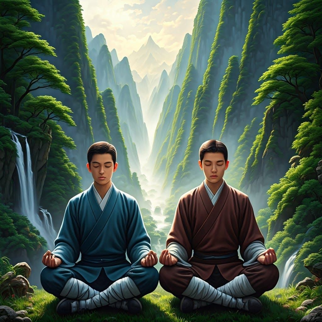 This image shows two boys meditating in the mountains. They are surrounded by lush greenery and misty waterfalls. The image is semi-realistic, with earthy tones and gentle brushstrokes.