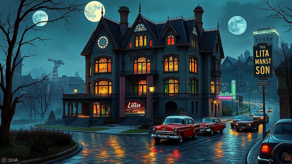 A striking picture of a Victorian mansion on a hill. Below, a cyberpunk metropolis glows with neon. Vintage cars line the cobblestone driveway, all rendered with vivid colors and expressive brushstrokes, blending fantasy and futurism.