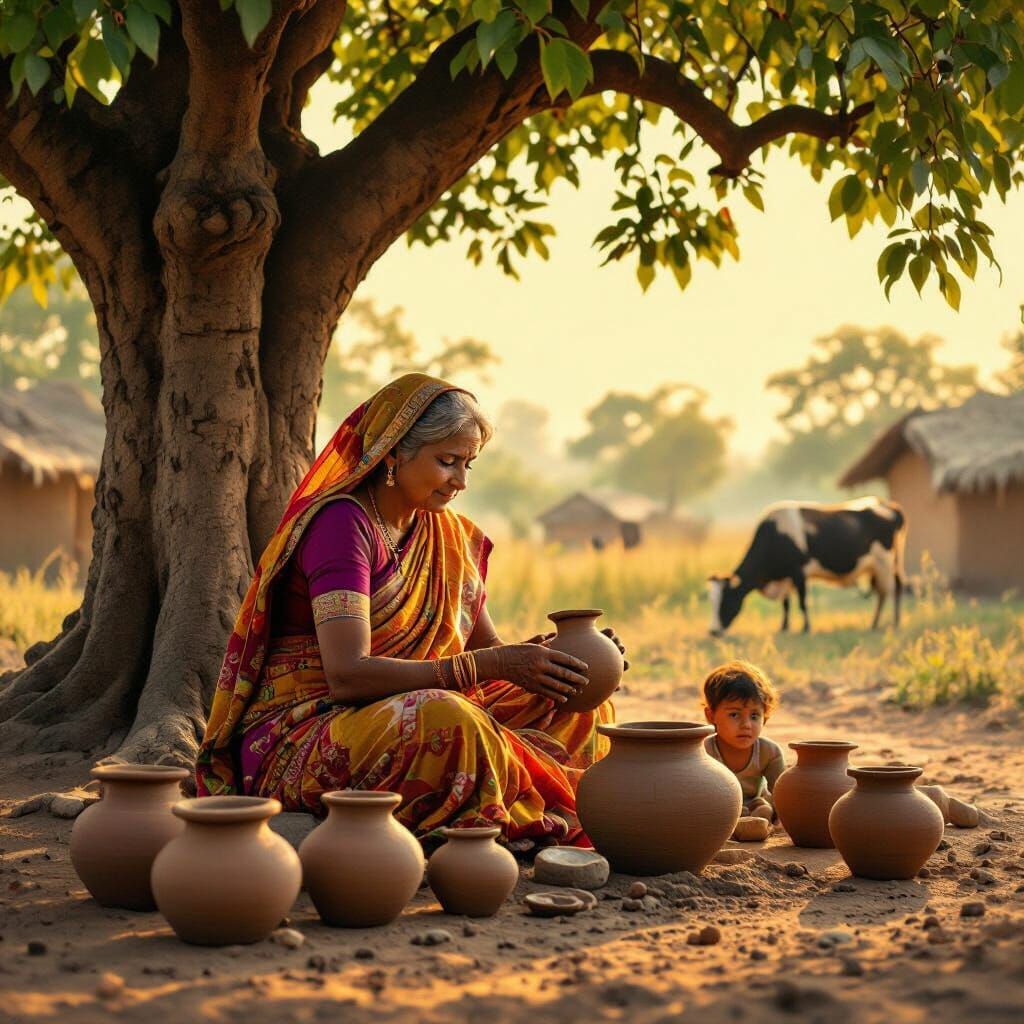 This image shows an elderly village woman in a traditional sari, peacefully crafting a clay pot under a banyan tree in the warm evening light. Children and grazing cows surround her in this folk art scene.