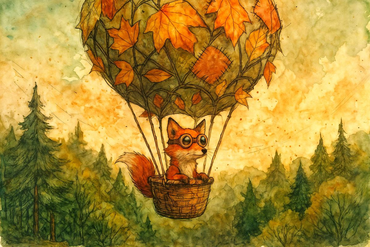 A mixed media artwork shows a fox wearing aviator goggles piloting a whimsical hot air balloon through an enchanted forest bathed in the golden light of late afternoon, creating a magical and serene atmosphere.