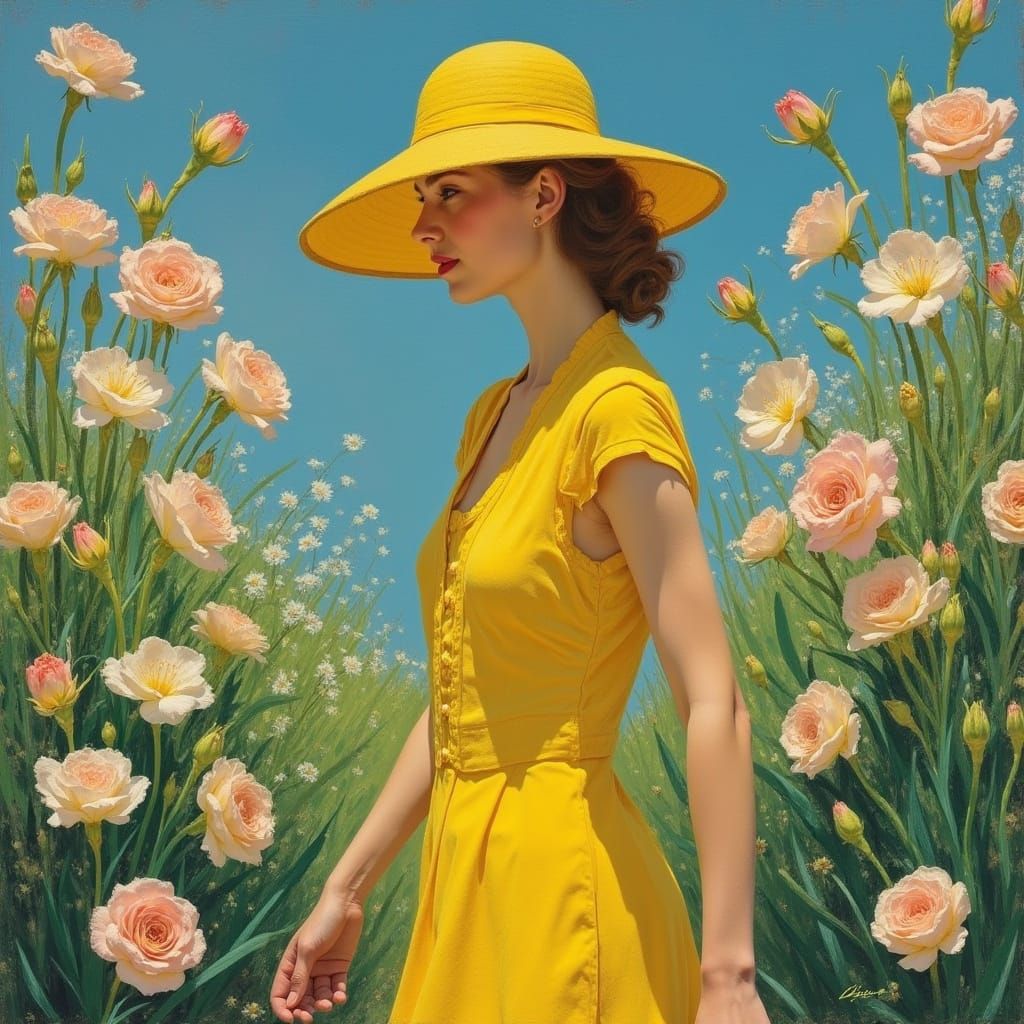 This image shows a charming European woman in a bright yellow 1920s-inspired gown, with a wide-brimmed straw hat and yellow silk ribbon, strolling through a lush garden filled with roses, lilies, and peonies, set against a clear blue sky, reminiscent of Impressionist art