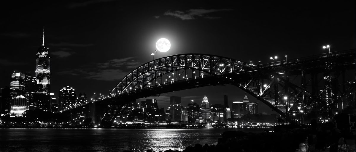This image shows a dramatic black and white photograph of a nocturnal cityscape. A large, detailed bridge is prominent against a full moon, with a skyscraper and a river reflecting city lights. Photorealistic.