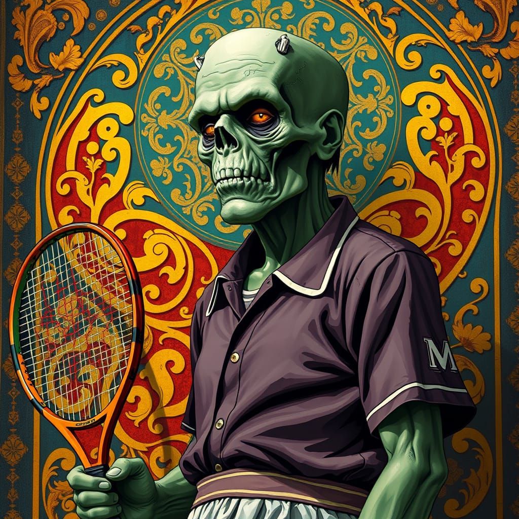 A decorative portrait of Frankenstein ready to play tennis. This image blends art nouveau elements with expressive brushstrokes and ornate details, in the style of Alphonse Mucha and Gustav Klimt.
