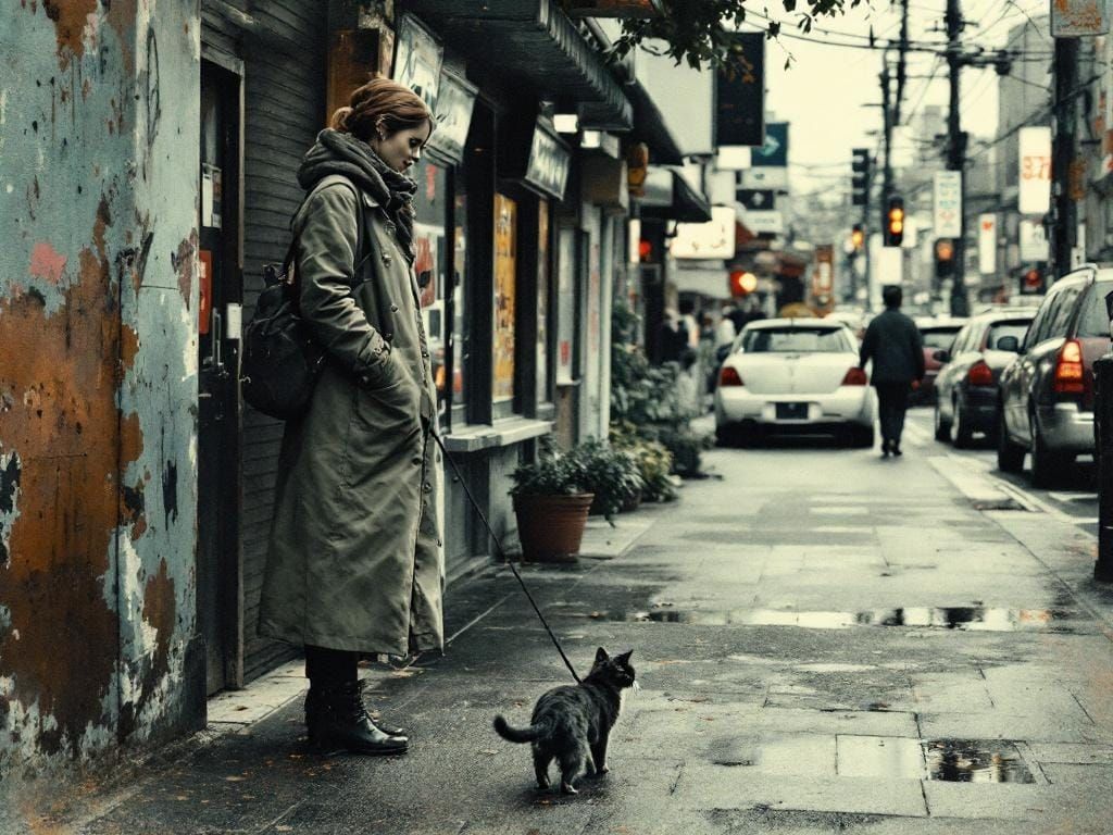 This image shows a woman walking a cat through downtown Tokyo, presented with a weathered, vintage aesthetic. The artwork features oxidized blue-green textures and rust-colored accents.