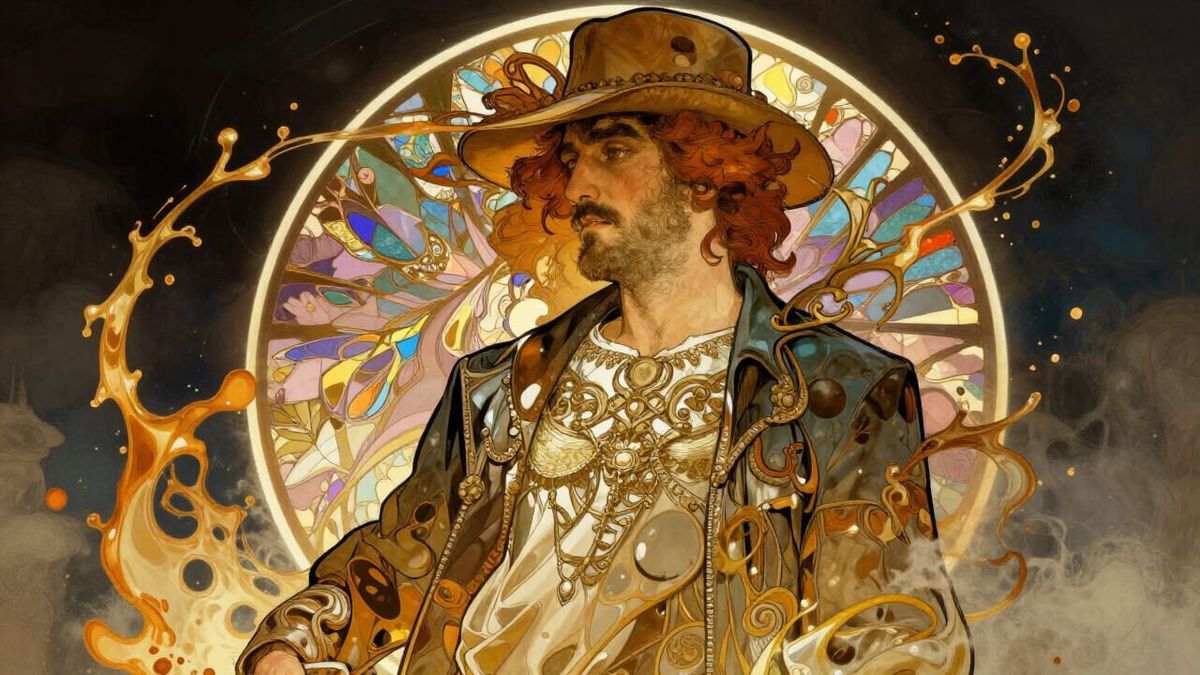 This hyperdetailed concept art portrait features dynamic lighting and triadic colors, inspired by Alphonse Mucha's intricate style.