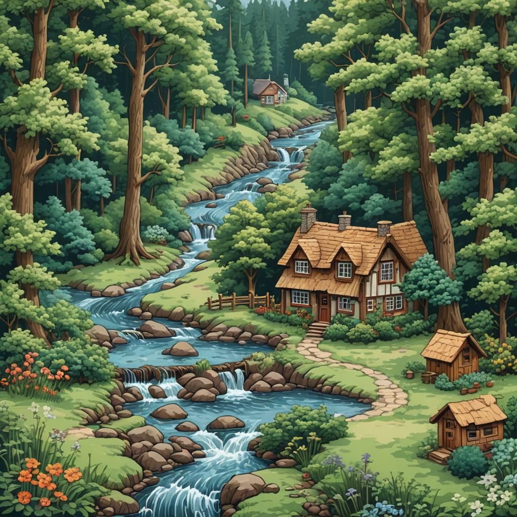 A small cottage in the woods with a stream flowing by. Style is pixel art similar to cross-stitch.