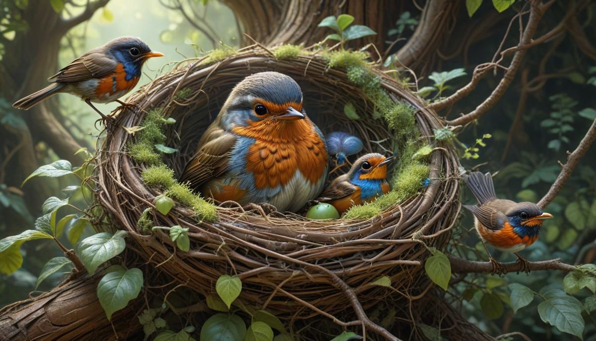 A hyperrealistic cartoon of a mother robin in her nest, watching her fledglings. The image blends fantasy with biological illustration and psychedelic colors to capture nature's beauty.