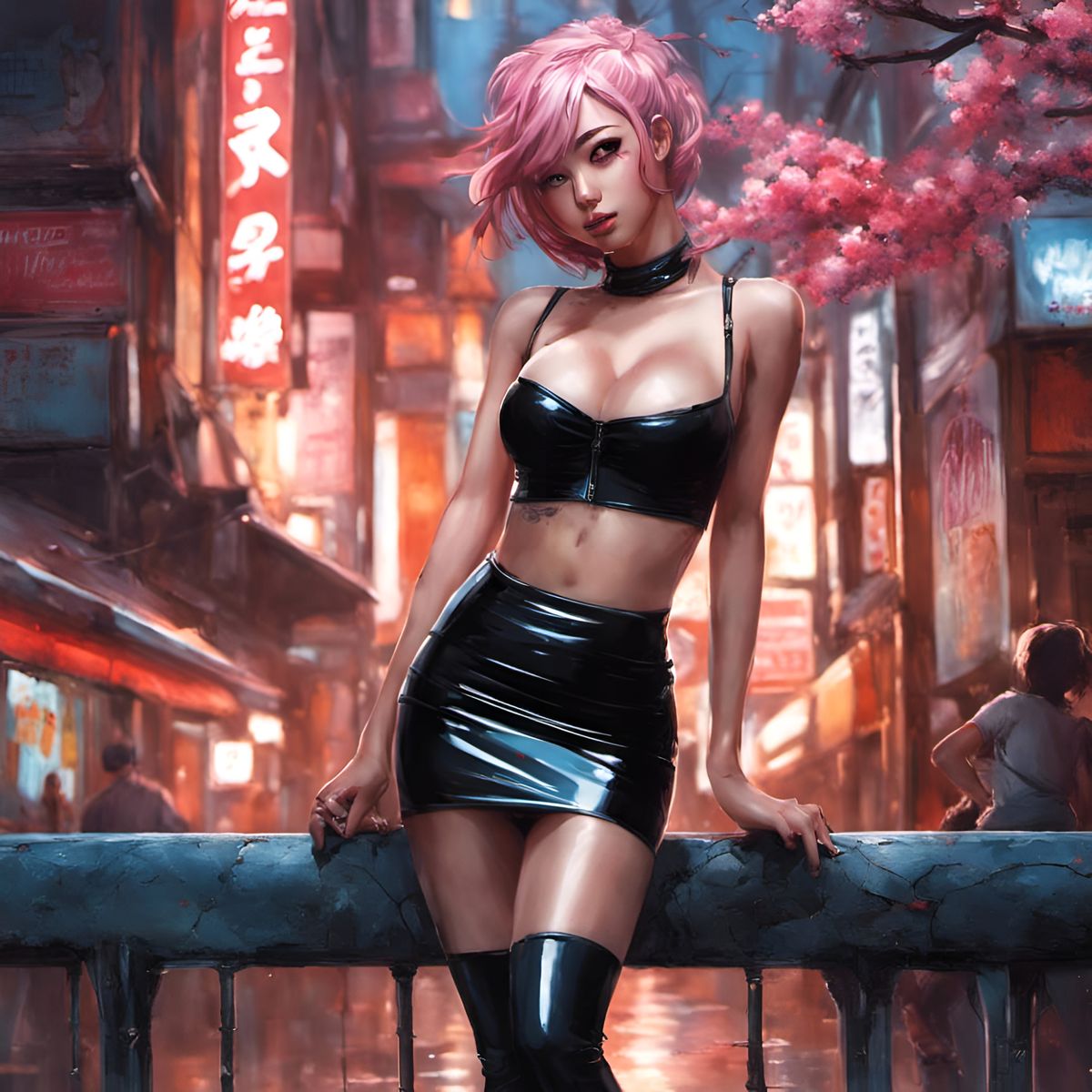 This image shows a flirty, body-fit depiction of Sakura from "Naruto" wearing a tight latex corset and short skirt. The intricate and hyperdetailed painting has a fantasy art aesthetic.