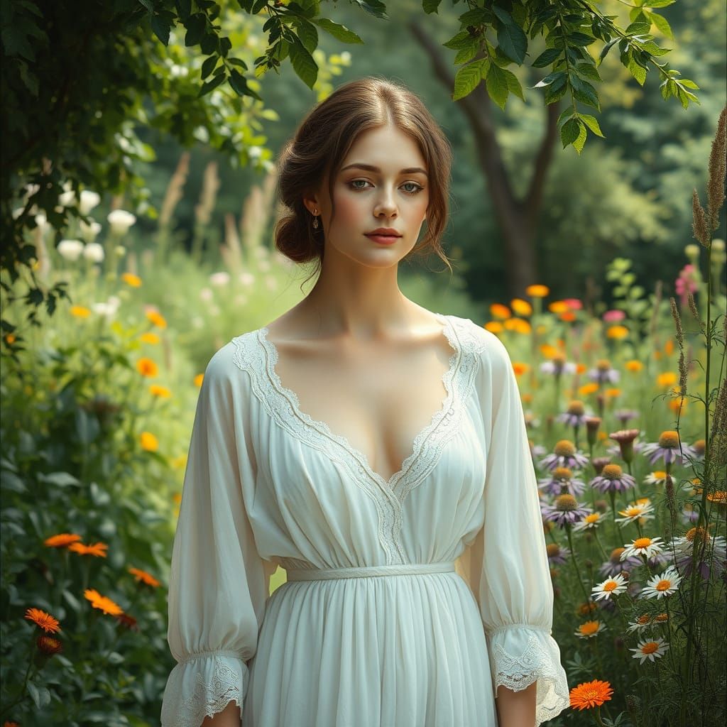 This image depicts a serene woman in a peaceful garden, surrounded by lush greenery and vibrant wildflowers, exuding quiet contemplation and humility, with intricate textures and delicate colors reminiscent of Pre-Raphaelite art and fantastical illustrations