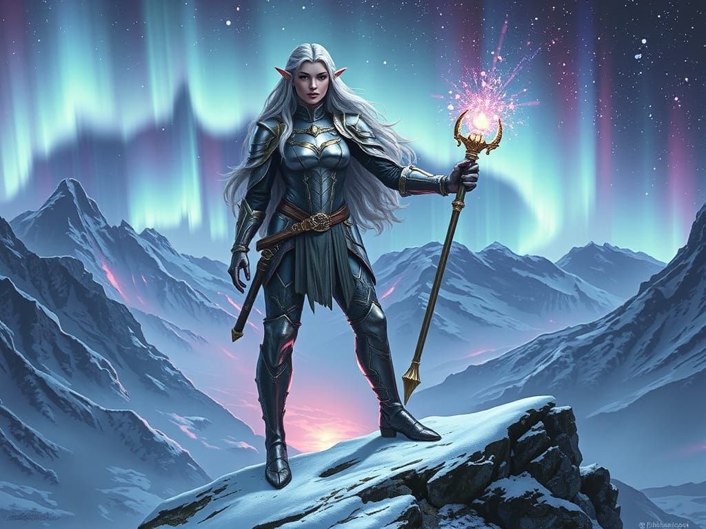A digital painting of a female elf warrior on a snowy mountain at night. She wears futuristic armor, wields a glowing staff, and stands beneath the aurora borealis in a space opera aesthetic.