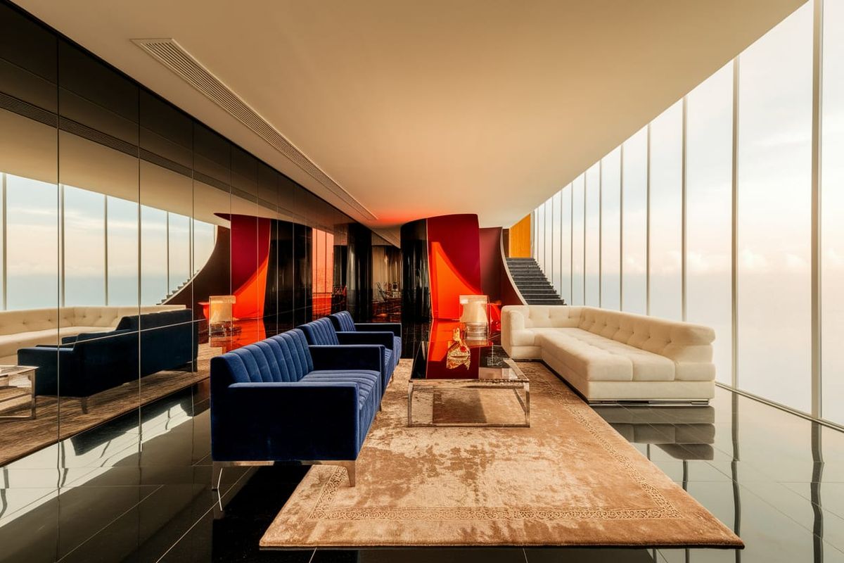 This image shows a modern, minimalist interior design featuring luxurious textures and reflective surfaces. Glossy lacquered glass furniture, mirrored walls, and plush velvet sofas in deep jewel-toned hues are set against a backdrop of warm, bold colors. The space is accented with soft, muted rugs in gol...