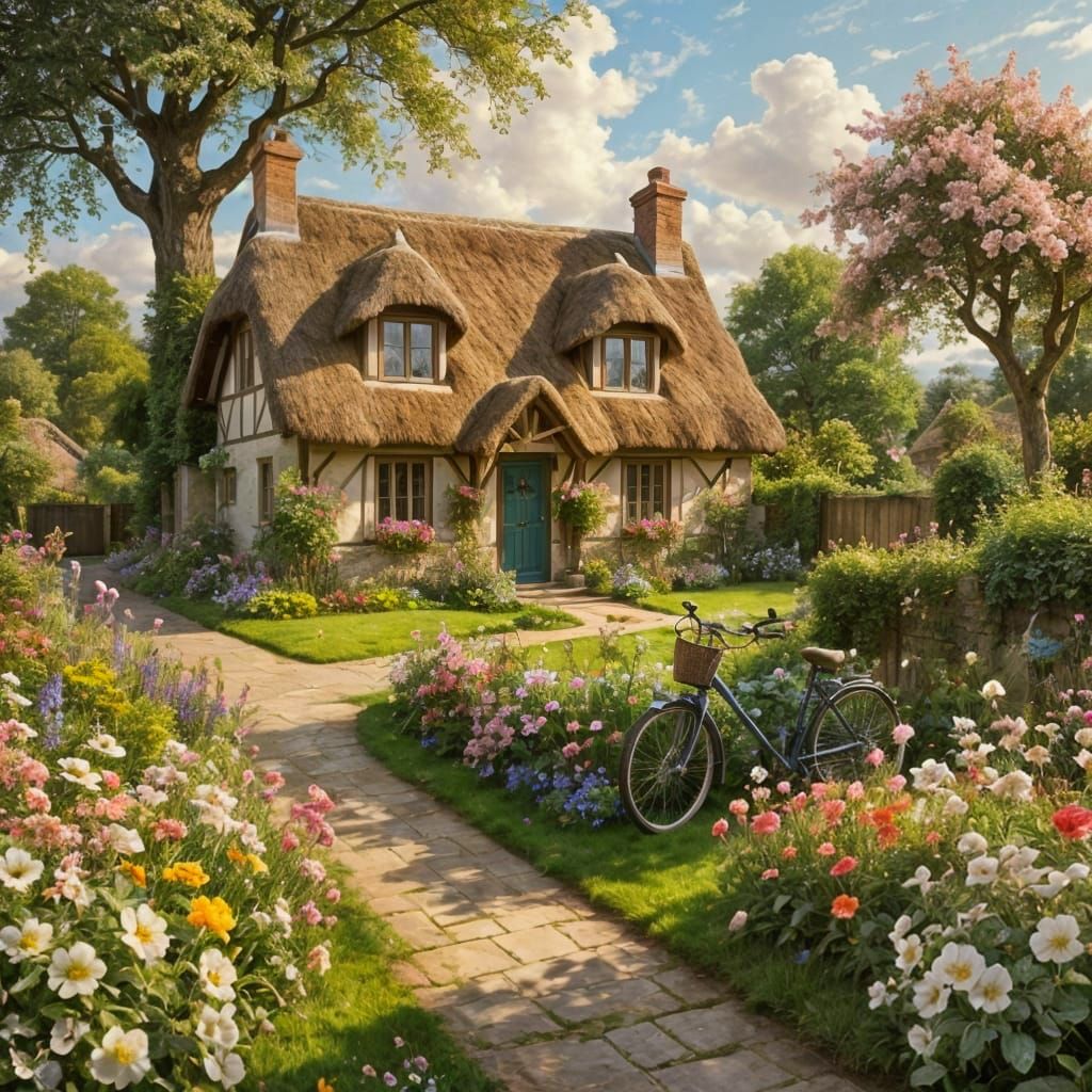 A vibrant painting of an idyllic English cottage and garden. This image shows a thatched-roof house surrounded by flowers, a blossom tree, a quaint road, and a bicycle, all in an art nouveau style.