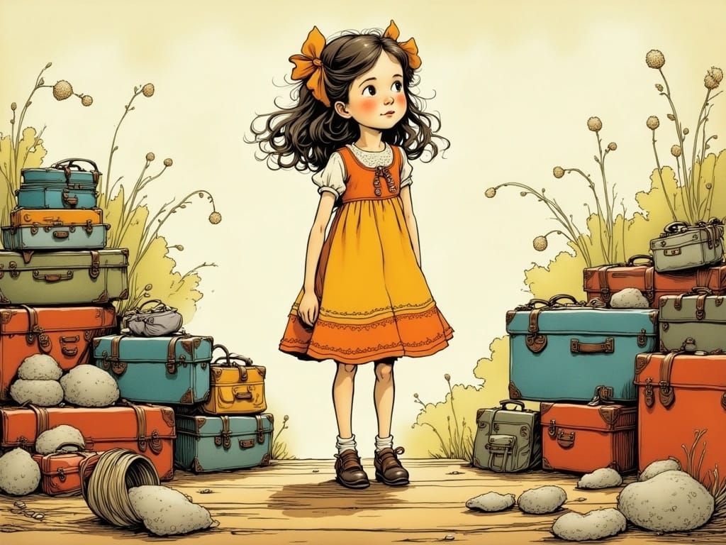 This image shows a nostalgic scene of a young girl waiting on a platform surrounded by luggage, set in a retro-futuristic world with a blend of classic and futuristic elements.