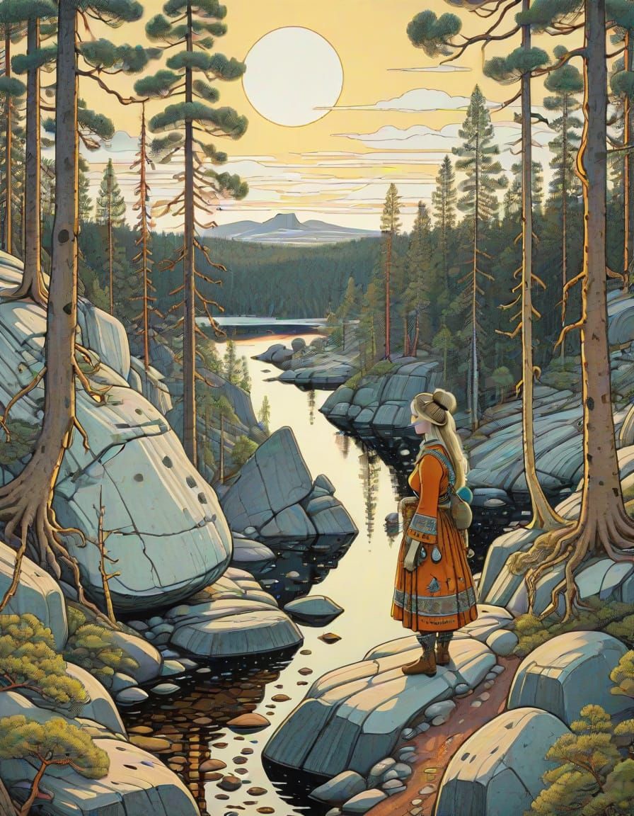 This enchanting scene depicts a young Finnish girl exploring a mystical northern land, surrounded by twisted pines, strange rocks, and tiny creatures. The artwork combines traditional folk elements with intricate, hyper-realistic details, evoking a sense of wonder and magic.